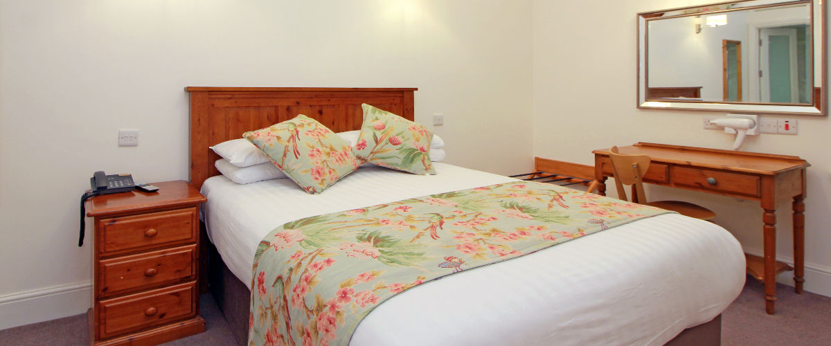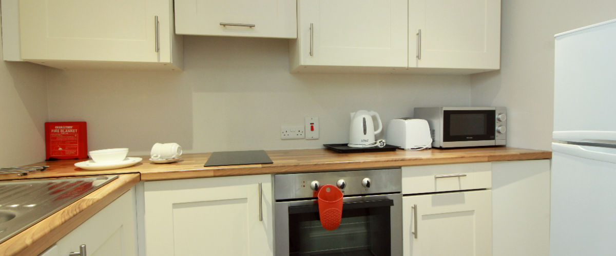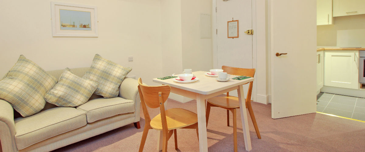 Appartement Une Chambre avec Chambre Séparée, salle de bain, et un lit double & une Cuisine/Séjour séparé avec équipement pour cuisine, espace repas et espace pour s’asseoir. Pour 2 personnes.